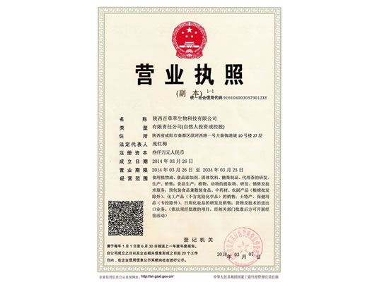 陜西百草萃生物科技有限公司,位于陜西省咸陽市秦都區(qū)濱河西路1號大秦御港城,公司成立于1996年,主要從事天然植物種植、研發(fā)、生產(chǎn)、加工、銷售為一體的高科技企業(yè)。主營醫(yī)藥原料、保健品原料、化妝品原料,精細化工原料。公司致力于人類健康保護事業(yè)“ 以科技為動力,以質(zhì)量求生存” 的本質(zhì),依托陜西高新科技技術(shù)人才和科研優(yōu)勢,已形成多學科、全方位、高層次的技術(shù)管理精英團隊。充分利用秦巴山區(qū)的天然藥物資源,歷經(jīng)多年發(fā)展為打造百草萃生物品牌奠定了基礎。